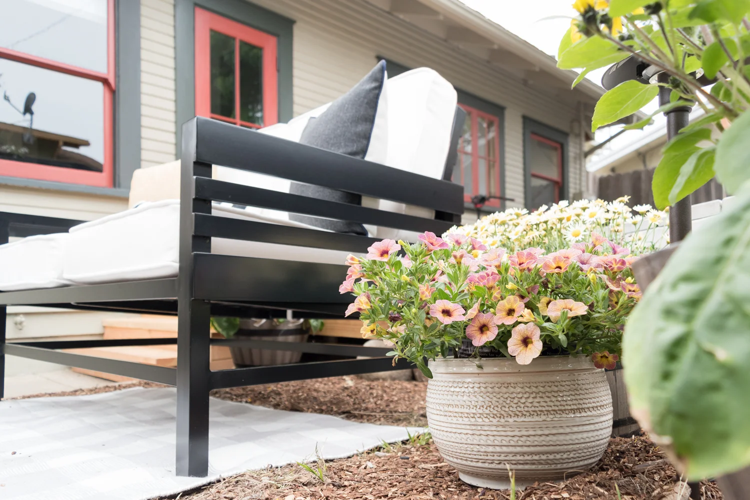 What a difference some black paint, a weed whacker, flowers, beautiful furniture, and a few accessories can make, right?!