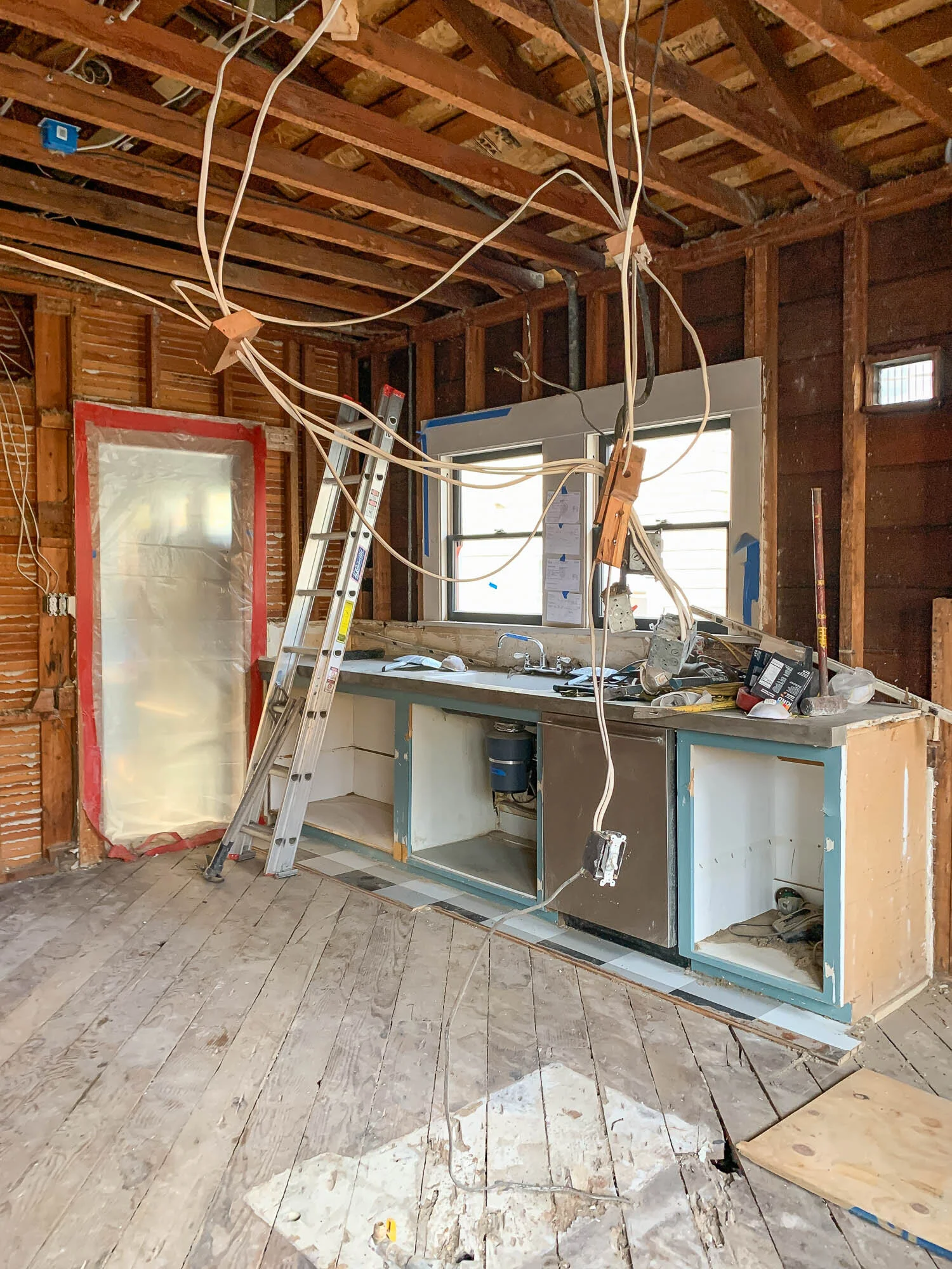 It’s worth noting that the demolition in our kitchen has been much more involved than what we may often see on HGTV. You may have seen TV clips of a contractor kicking their foot through the wall, or a couple taking a swing at a cabinet and taking the whole thing down in a second. That’s not the case here. Our kitchen is made up of the original plaster and lath construction. It’s hard, heavy, solid plaster - much like concrete, and then thousands of strips of wood nailed to the studs. This isn’t something you can just kick your foot through and pry off with your hands in a couple of minutes. The team of 3-5 guys has spent days pulling all of the walls down. Imagine if I did that all by myself - it would have taken me months. Oof. In addition, we’re replacing all of the plumbing with new stuff so they’re tearing out the big, heavy, cast iron, and they’re ripping out the old electrical. This isn’t just a quick remodel!
