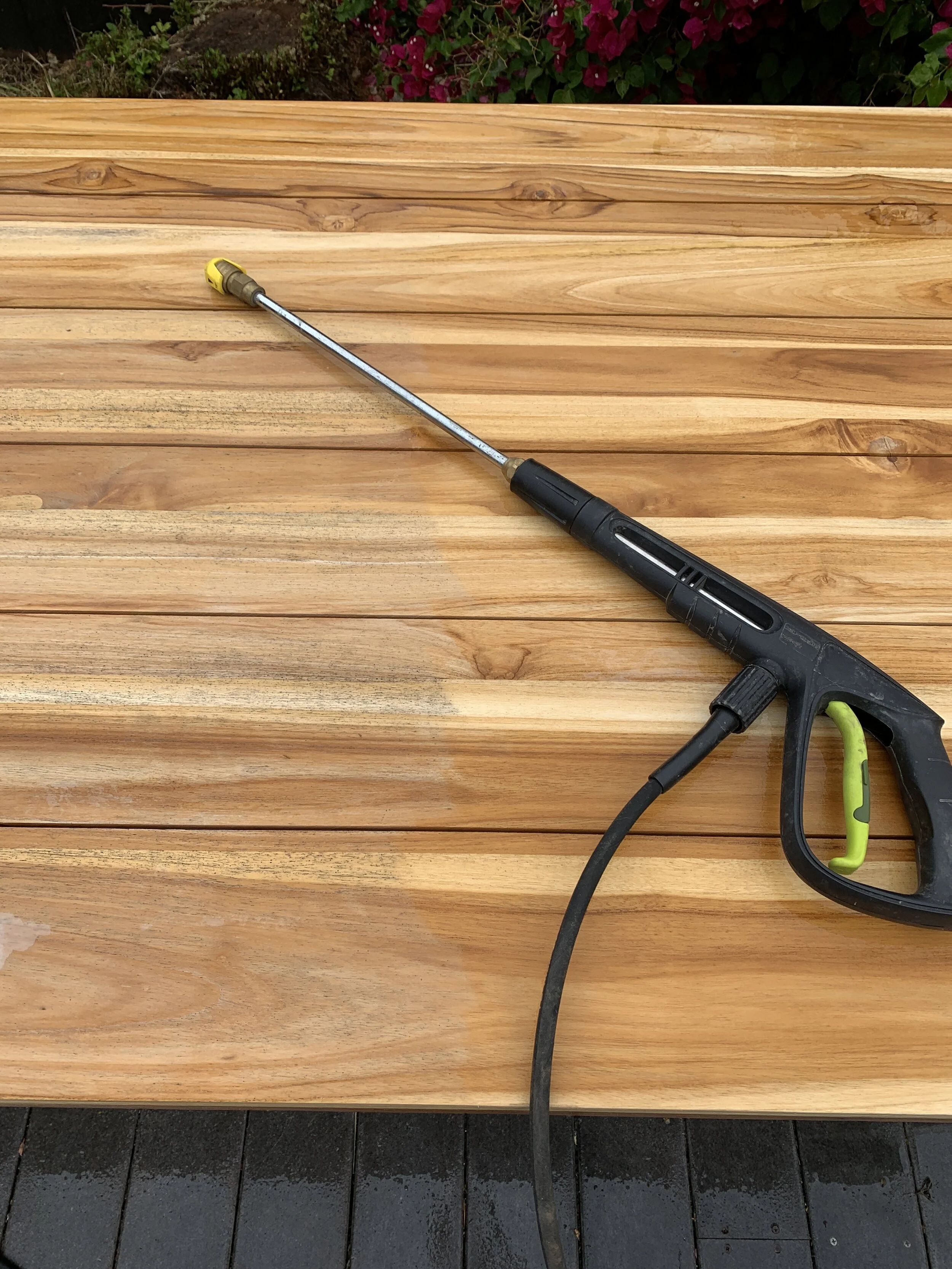 The TLDR: Clean your grey/mildewy teak with this, then protect it with this. I used to do extensive cleaning and previously sealed it with a product that let me down. So I went back to the drawing board and ultimately chose those two products and I’m so pleased. It’s been several years and the table it’s holding up fantastic! Plus, the cleaner works wonderfully - no more power washer and sander!