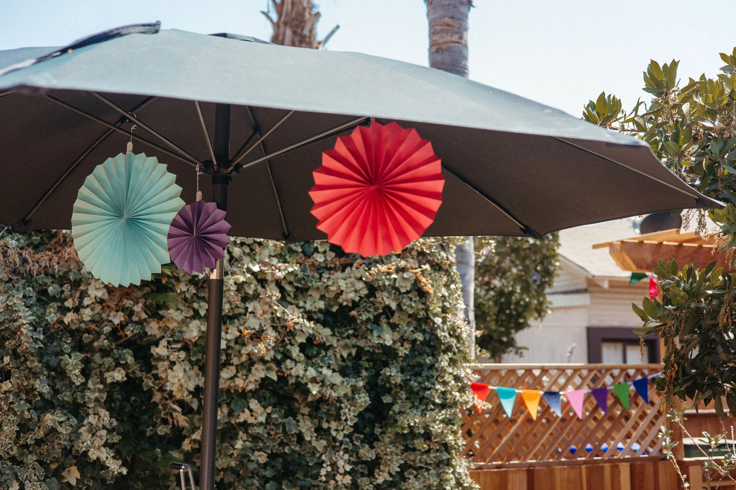 The rainbow pennant banners were a nice border around the yard, but I also added these colorful hanging paper fans to add a little oomph to the otherwise plain underside of the umbrellas. The set comes in a bunch of colors and the fold up compactly so I can decorate with them time and time again.