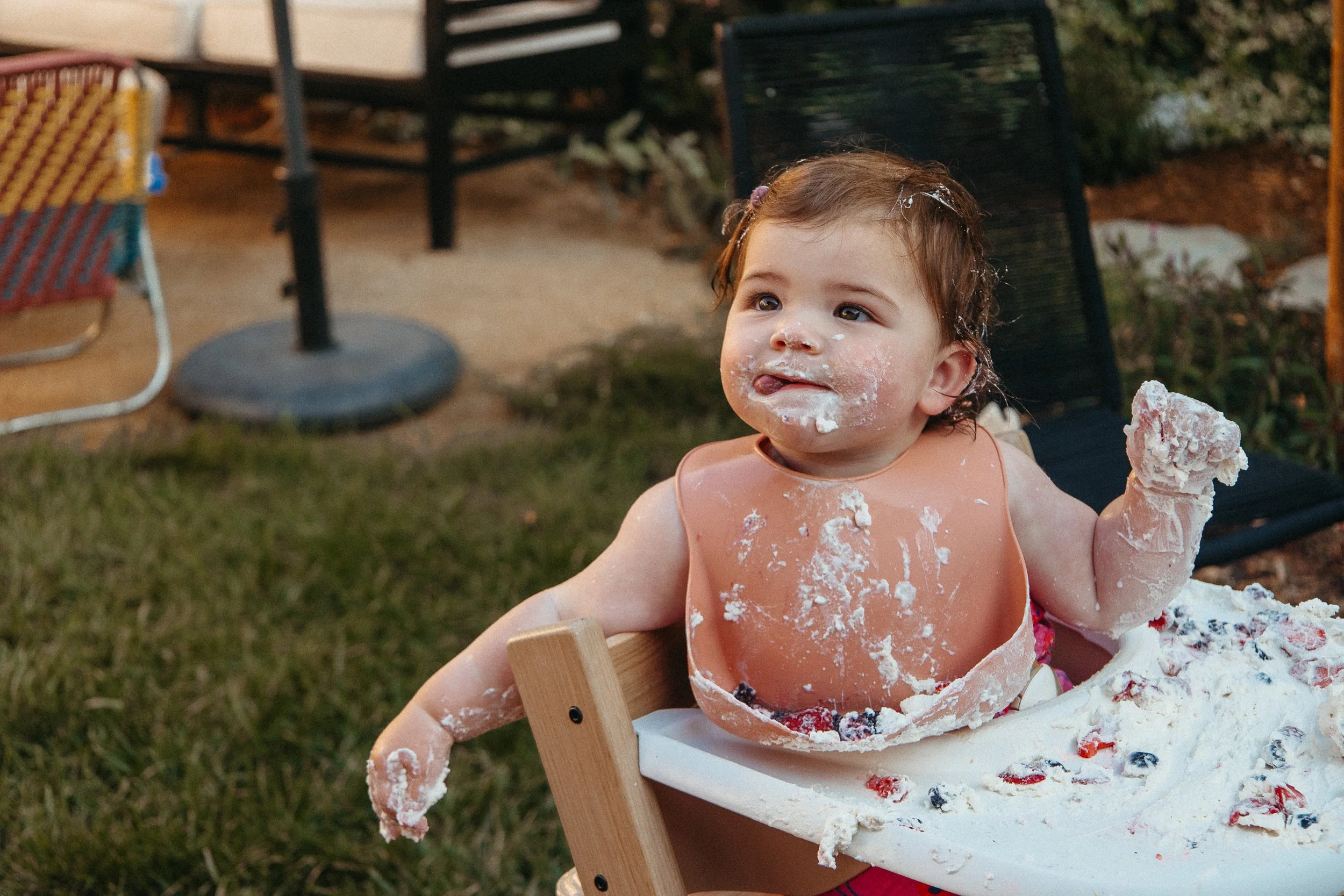 While friends and family noshed on homemade lavender-honey cupcakes, we gave Margot her own treat. Sure, we could have done the traditional smash cake, but what Margot really wants to sink her (two!) teeth into is a pile of berries. Cake shmake - get the girl some berries!