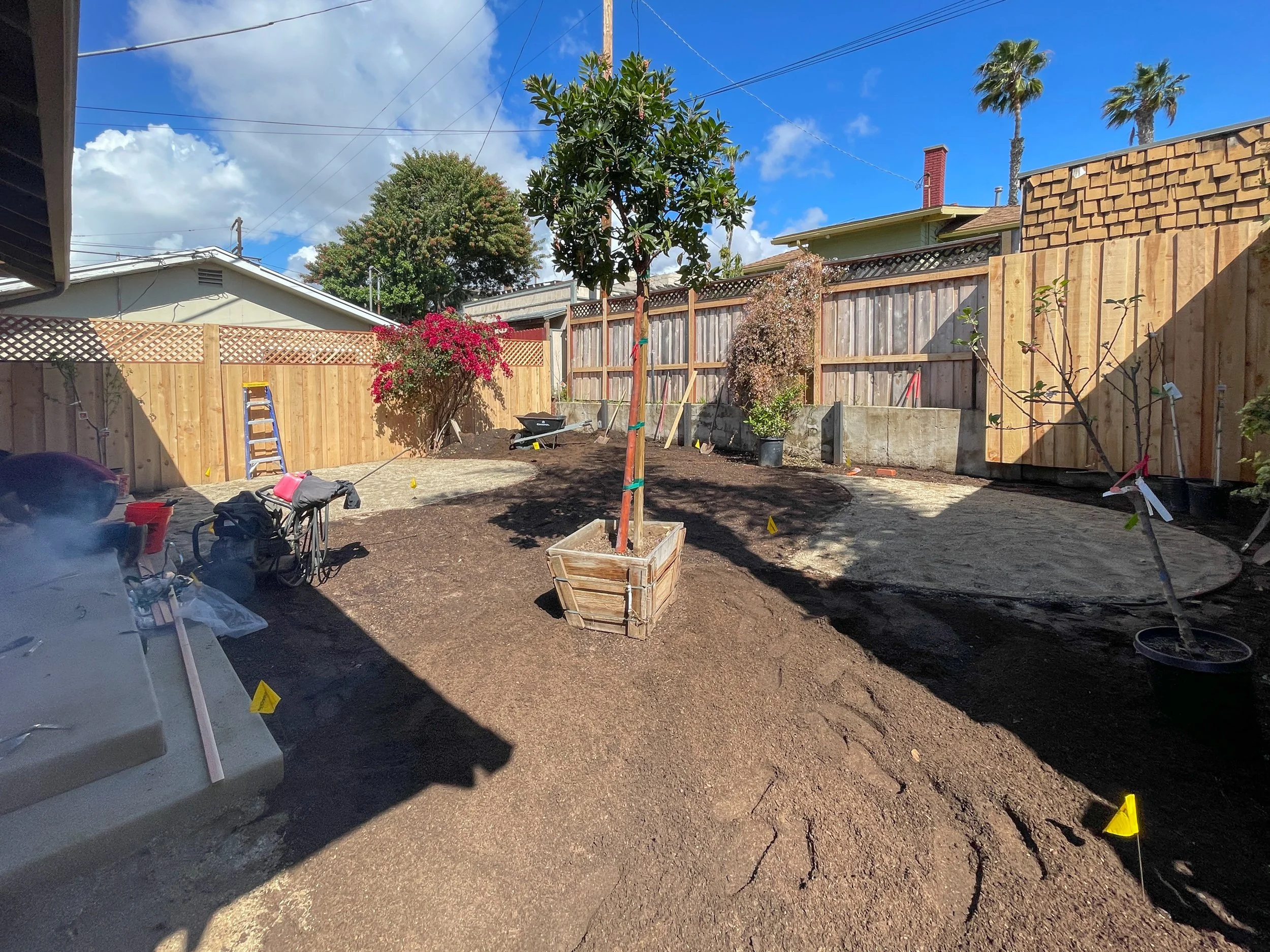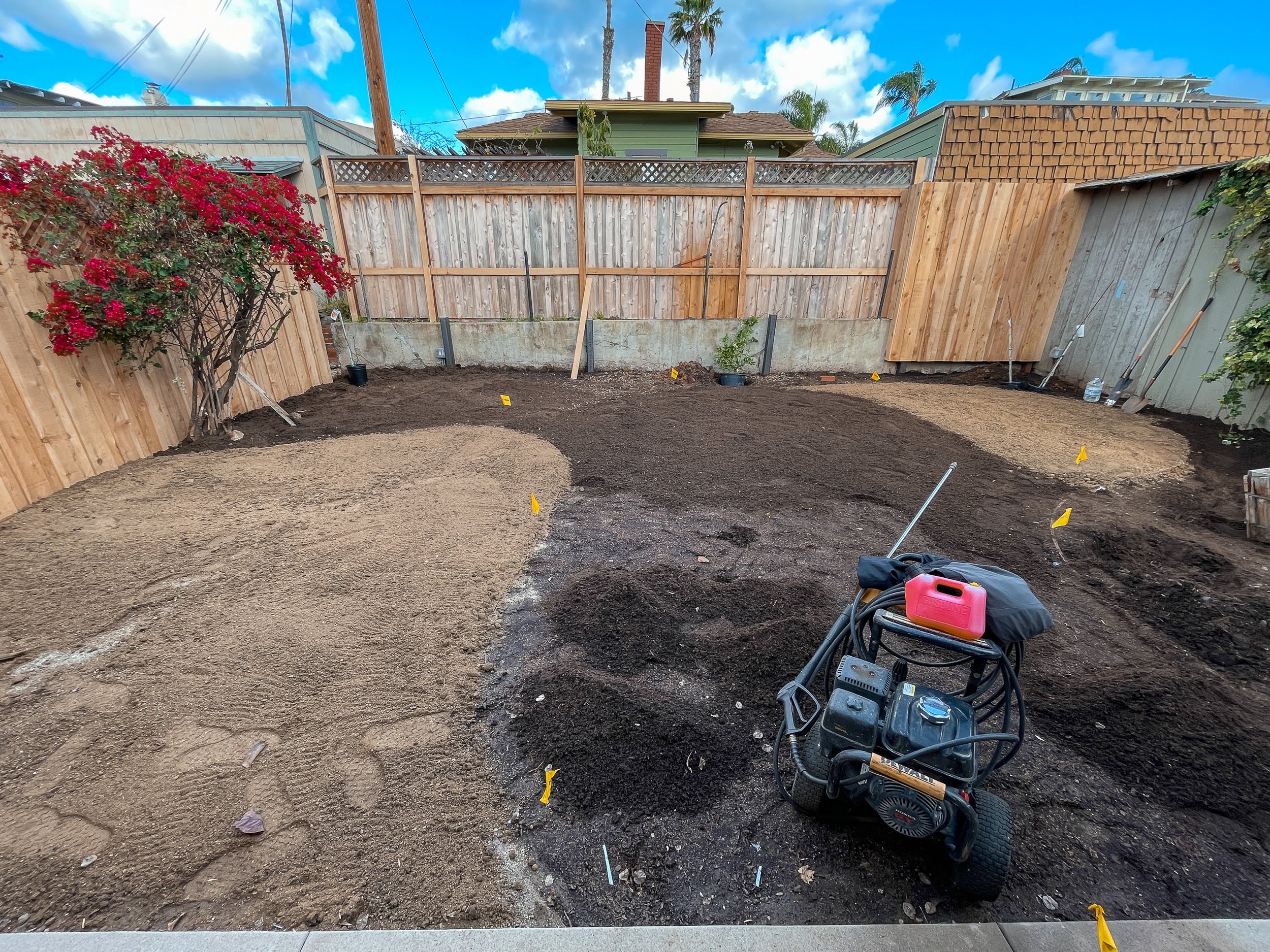 Once set, the crew started filling each curvy shape with a material. Top soil for garden beds and lawn, and stabilized decomposed granite (DG) for hardscaping underneath the dining table and seating area. Remember how I said I don’t like concrete? Well, we used DG instead of concrete because the crushed rock will absorb rainwater and pass it through to the soil below. Instead of our yard shedding water down the drain, it gets absorbed like a sponge and keeps the precious resource available for our landscape. This is so valuable in our Southern California region where rainwater is scarce.