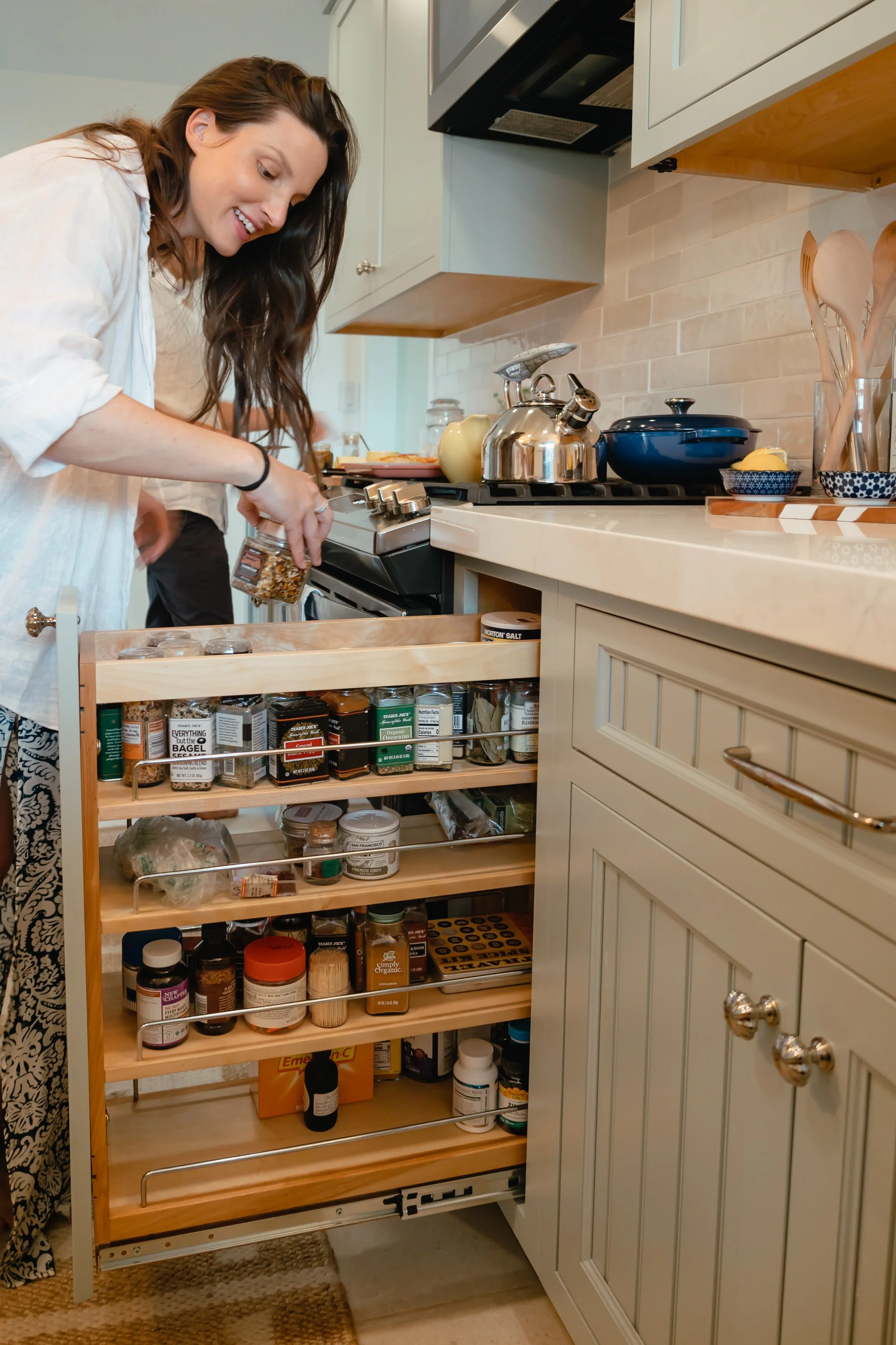 Throughout the design, she kept an eye out for smart places to have the storage work even harder. She specified deep drawers for pots and pans, a spice pull-out positioned right next to the range, and a narrow vertical cabinet for cutting boards and baking sheets. While the kitchen didn't get bigger, it definitely got better at being a kitchen.