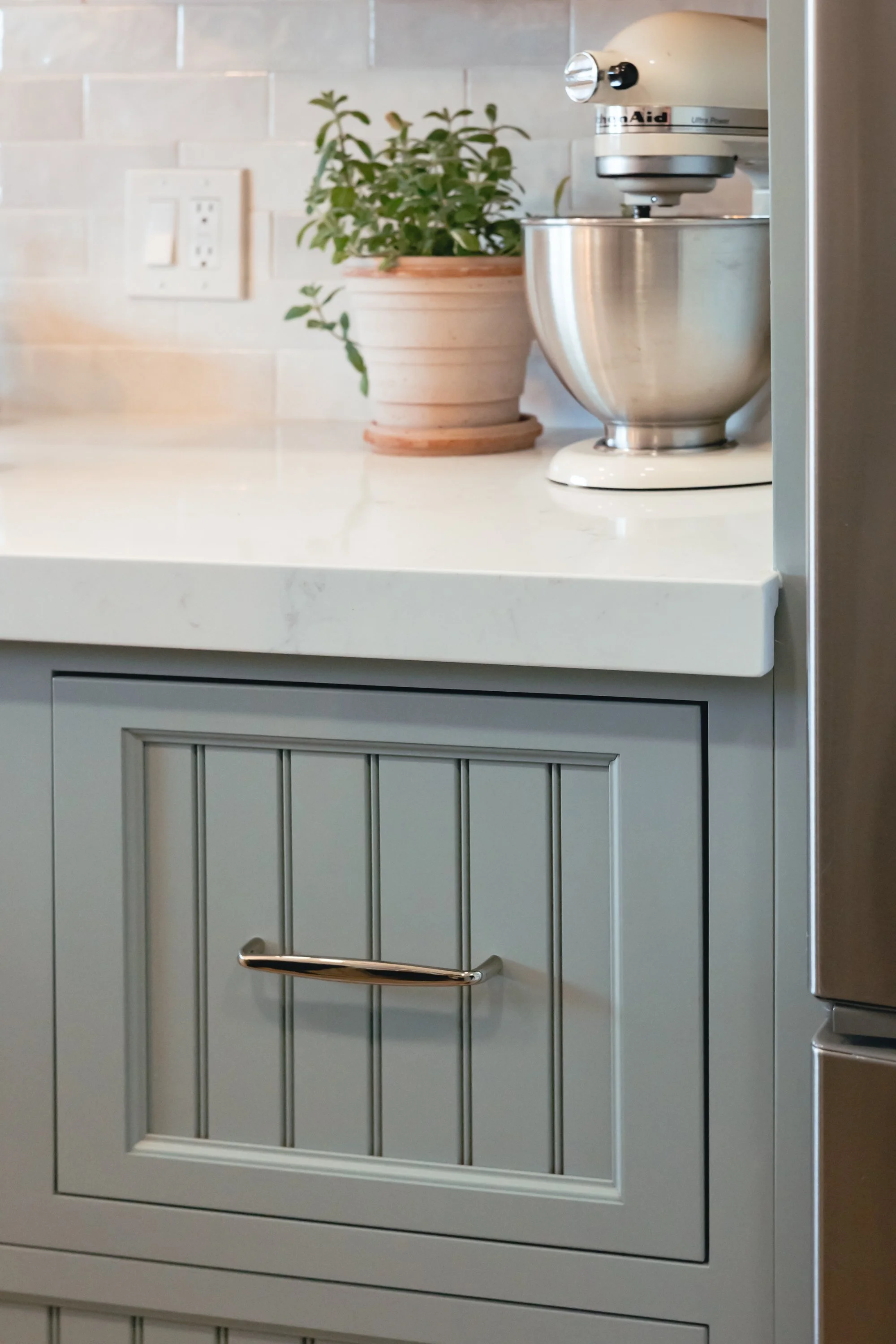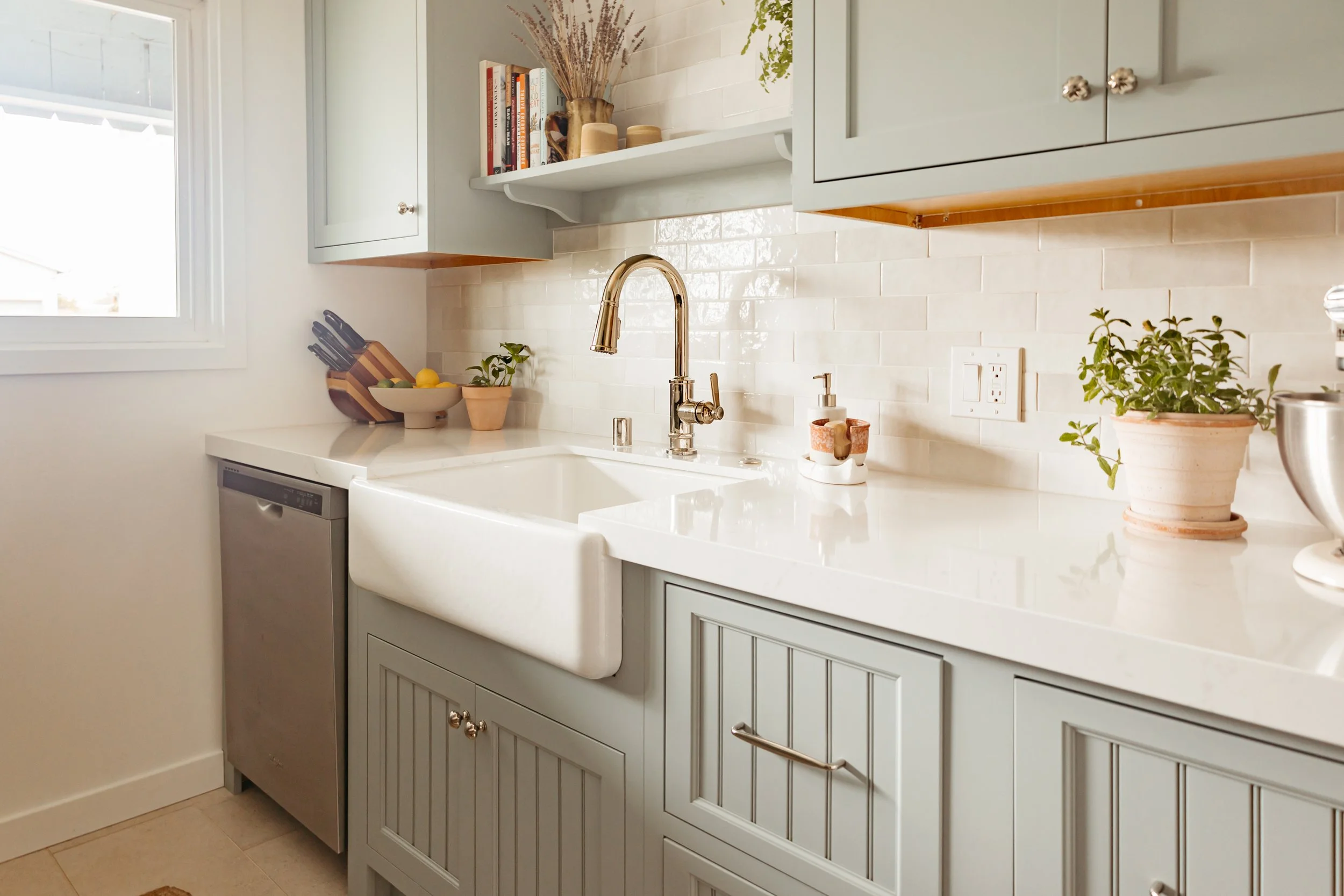 In the small space, we knew cabinets would be a main design element - so we leaned into giving them their own personality. Caroline had a very specific vision of cooking in "a farm cottage in the Italian countryside.” So, we wanted cabinets with a unique door style, old-world construction, and a soft cottage hue.